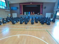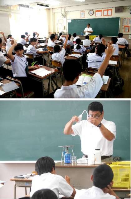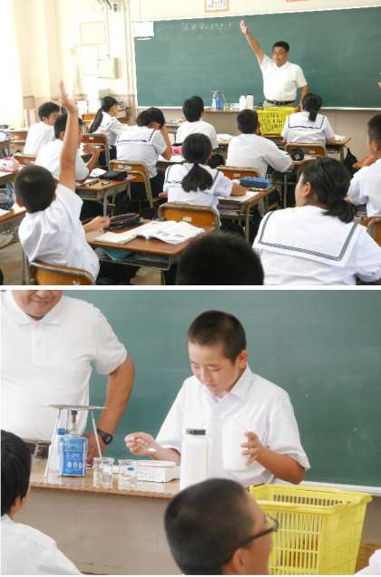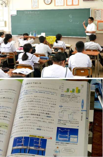 1年生の理科の授業です。塩化ナトリウムや、ミョウバンなどを水にとかし、水に物質が溶けるきまりの復習をしています。溶け残りを温めるとさらに溶けます。
