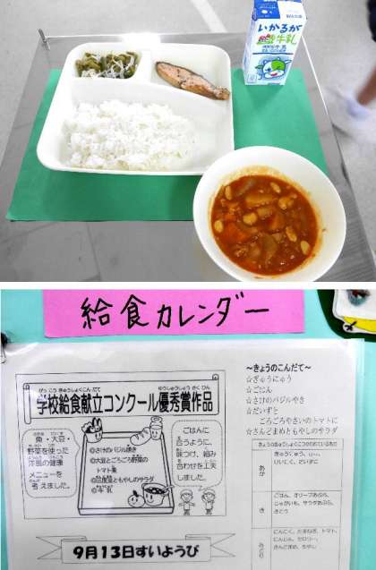 今日の献立は、鮭のバジル焼き、大豆とごろごろ野菜のトマト煮、さんど豆ともやしのサラダ、ごはん、牛乳でした。