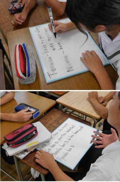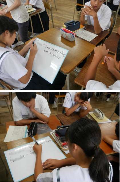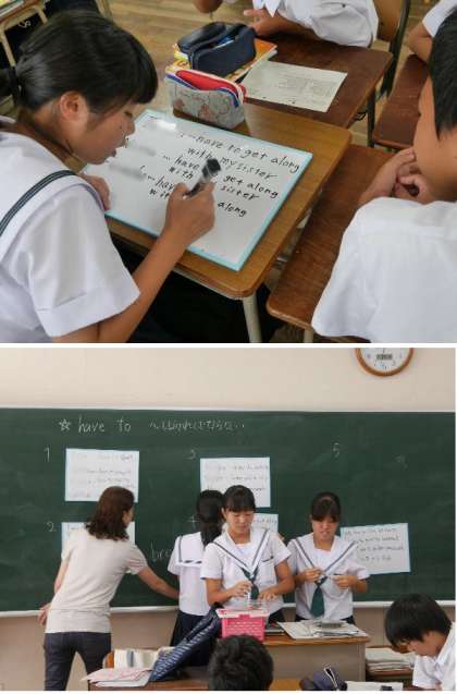 東三国中学校では、学習方法の工夫に取り組んでいます。ホワイトボードをすべての学級で使えるようになったので、各授業ではホワイトボードを活用した、グループ学習などが取り組まれています。英語では、「have to 〜しなければならない」というフレーズを学習していました。各グループで「have to」を使った文章を考えて発表していました。