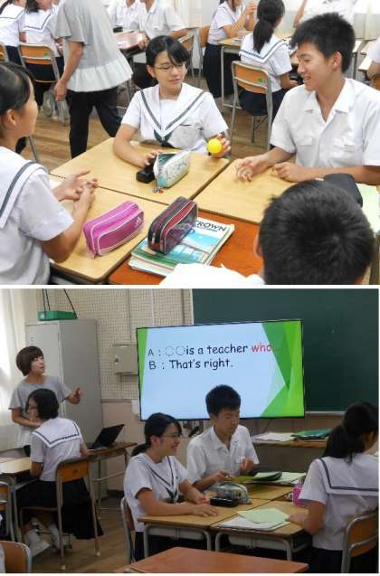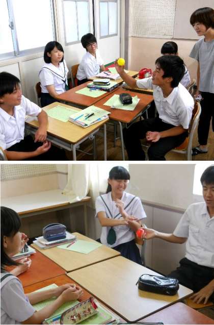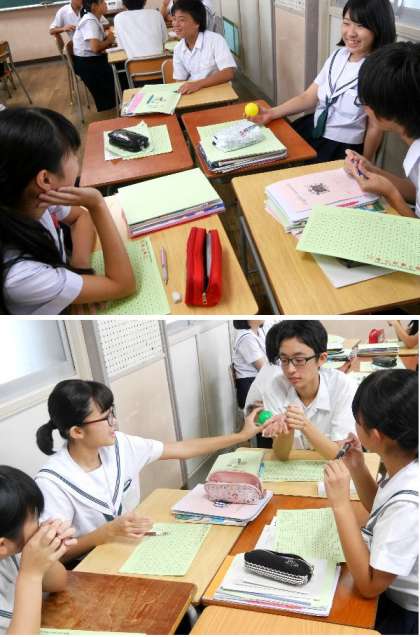 3年生の英語では、グループに分かれて、カラーボールを順番に回していました。ボールがまわってくると、先生の示した例文を使って英作文を言います。そして、素早くボールを次の人に回します。タイムアウトの時にボールを持っていたら負けです。ゲーム感覚で楽しく英語を学習しています。