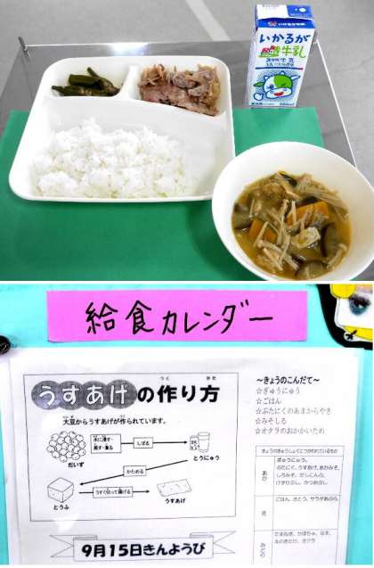 今日の給食は!ごはんは大盛りでスタミナつけよう