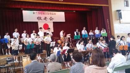 東三国地域の敬老会が東三国小学校で行われました。東三国中学校から吹奏楽部が演奏を行い、地域のお年寄りの方々に楽しんでいただきました。