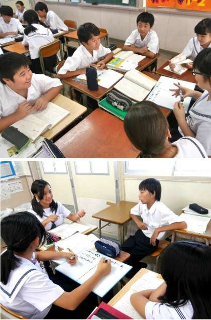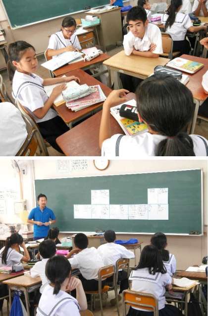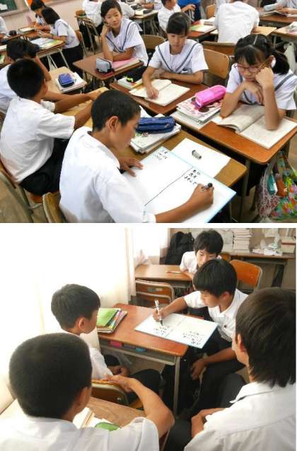 1年の国語の授業では、読書題材として向田邦子「字のない葉書」を学習しています。今日は班になって、身近な人の「日常の様子」と「意外な一面」について意見を出し合いました。人と意見をだしあったりするのは楽しいですね。