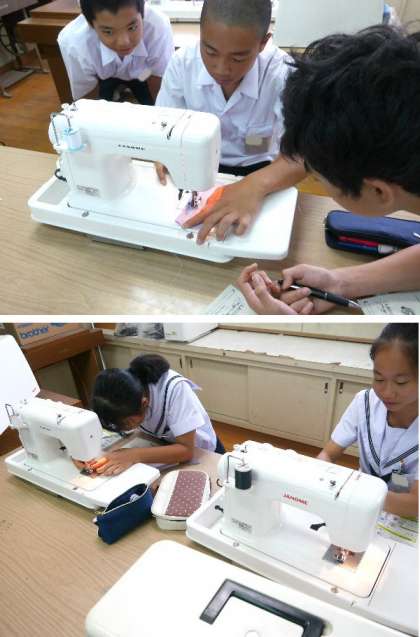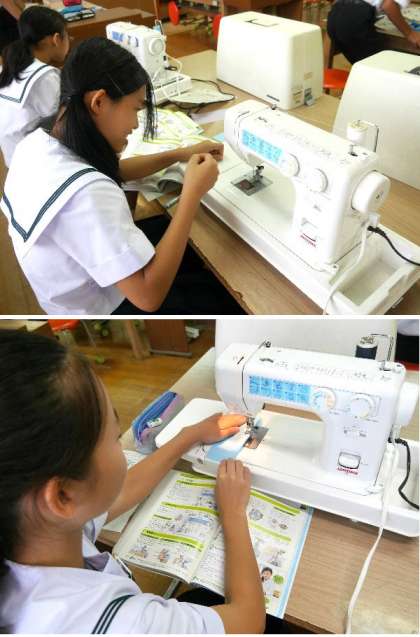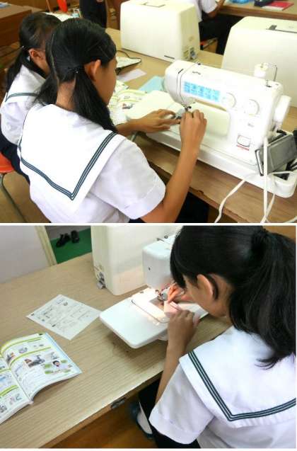 2年生の家庭科では被服実習を行っています。今日はミシンを使った実習です。練習用の小さな布にミシンをかけています。小学校でも使ったと思いますが、使い方を思い出しましたか。