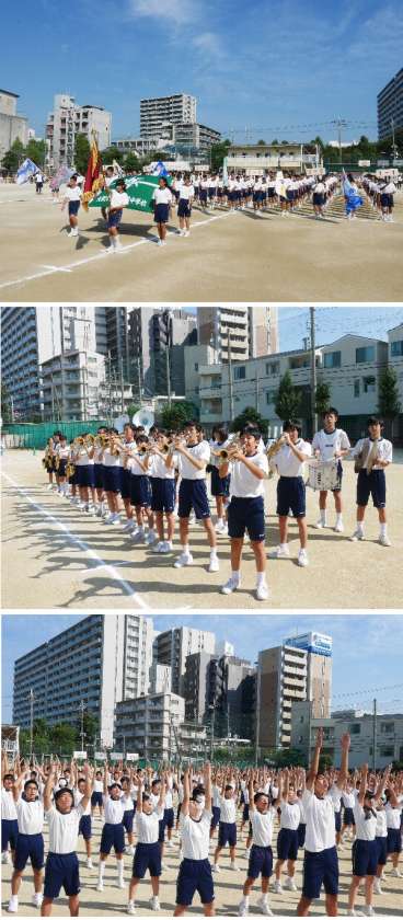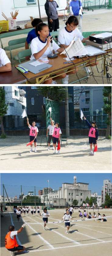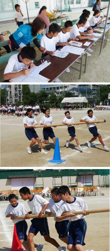吹奏楽部の校歌演奏で歌い、準備体操もきれいにそろっています。競技に出場するだけでなく、各係の仕事もしっかりと確認練習できました。1年生の学年団体種目もエネルギッシュでいいですね。