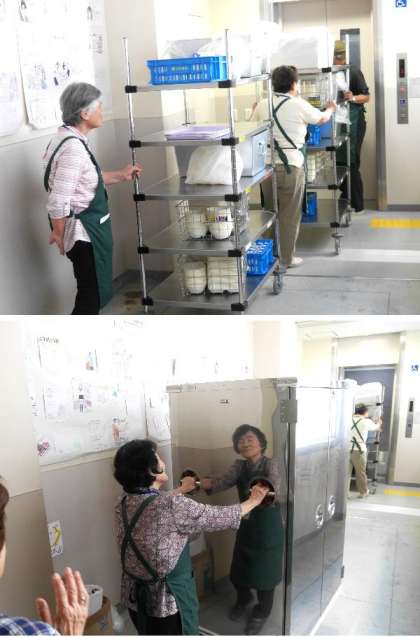 元気アップボランティアさん、ありがとうございます。いつも、重たい食缶を運んでいただいています。