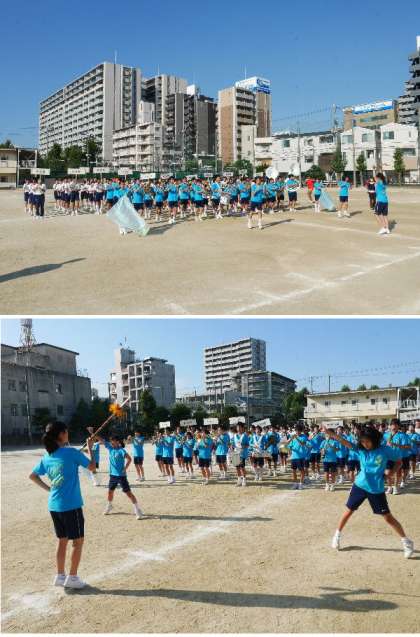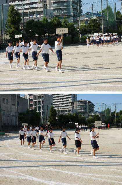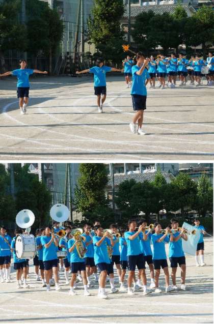 体育大会の午後一番にあるクラブ行進と対抗リレーの練習を行いました。吹奏楽部の演奏で入場です。
