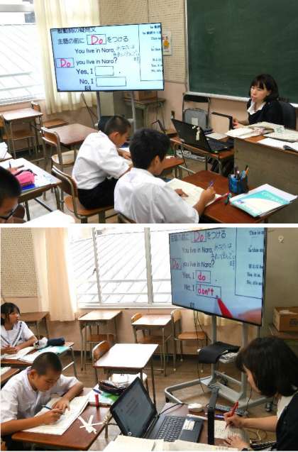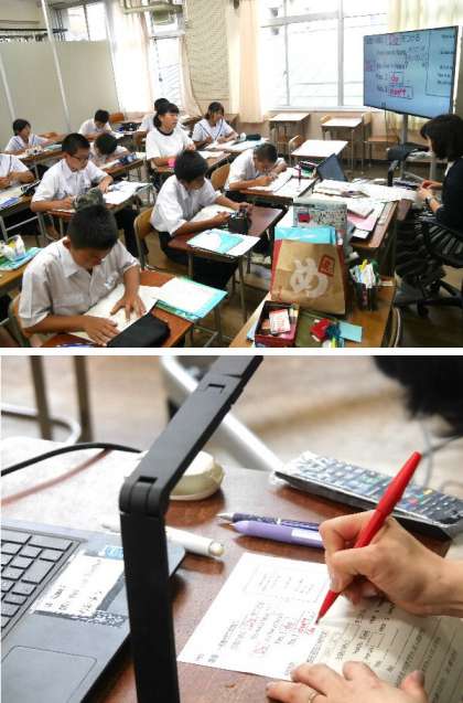 1年生の英語の授業です。少人数で多目的室で毎回学習しています。新しく設置されたワイヤレス書画カメラを使うと、どんなものでも大きくプロジェクタに映し出されます。プリントを大きく映して授業をしているところです。