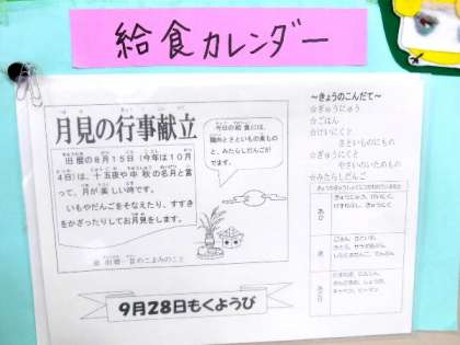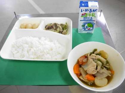 今日の献立は、ごはん、牛乳、鶏肉と里芋の煮物、牛肉と野菜の炒めもの、みたらしだんごでした。みたらし団子が人気です。10個以上たべている子もいました。