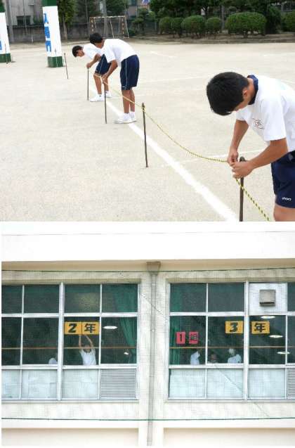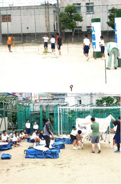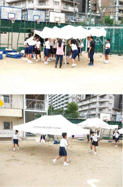 いよいよ体育大会が明日に迫りました。天候は午後から回復してきましたが、運動場が少しやわらかいです。午後から学級委員が全員で会場準備を行いました。テントもはりました。