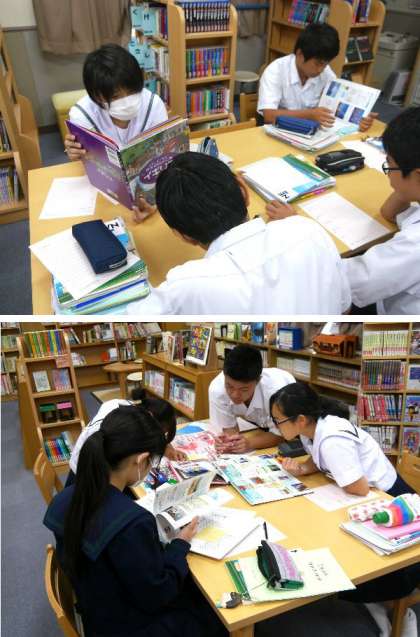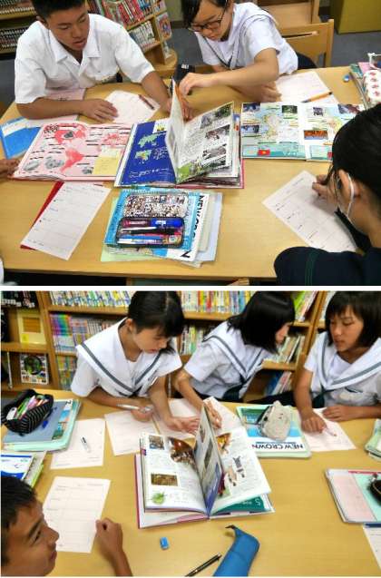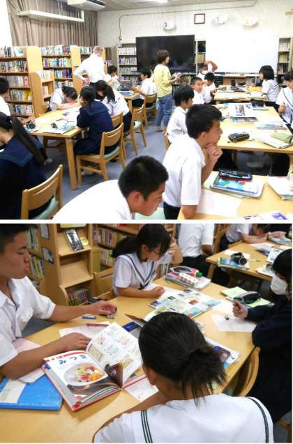 3年生の英語の授業は、図書館で調べ学習です。いろいろな国について調べているところです。行ってみたい国がありましたか。
