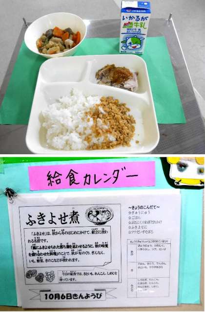 今日の献立は、ごはん、牛乳、豚肉のねぎだれかけ、ふきよせ煮、ツナだいずそぼろでした。
