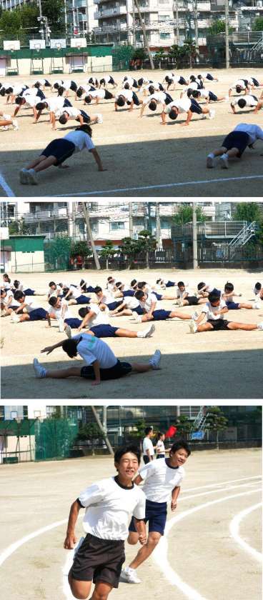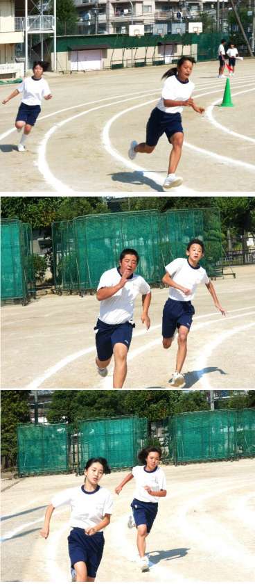 3年生の体育の授業が運動場で男女一緒にしていました。リレーの組を作るために、75mのタイムを記録しています。