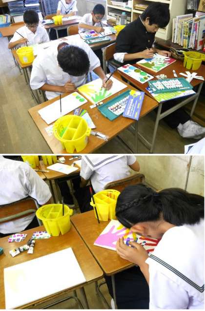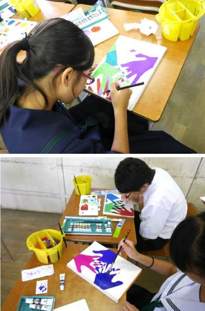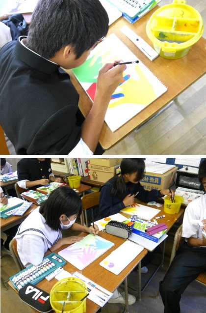 1年生が、色を選びながら丁寧に塗っています。自分の手を画用紙にかたどってデザインして色を配色します。きれいですね。