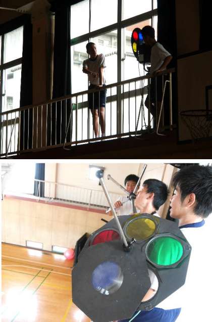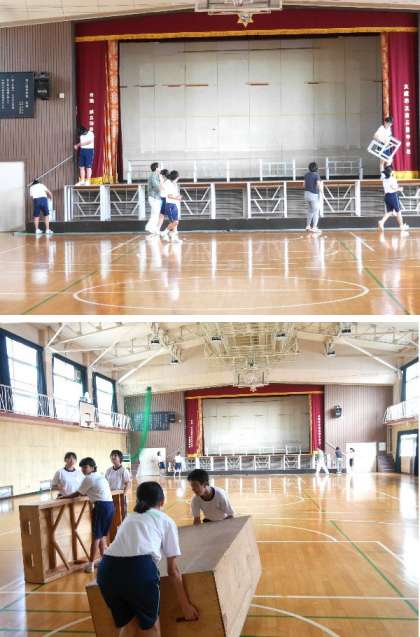 3年生が、体育館に舞台道具や照明を運びいれて準備をしています。