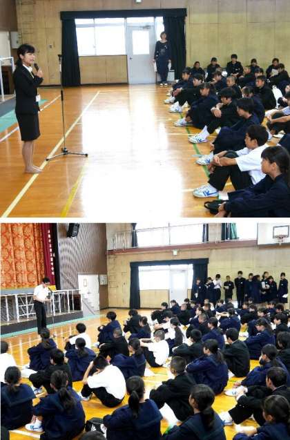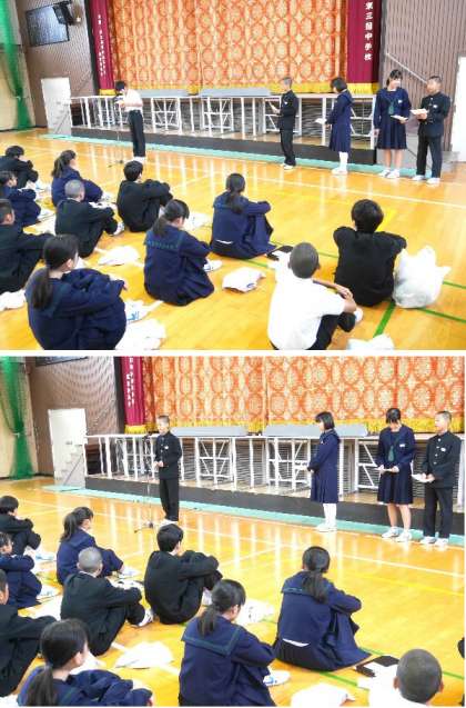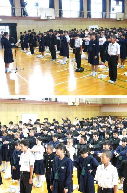 今日は雨なので、体育館で全校集会をおこないました。教育実習の先生を紹介しました。校長先生からは、品格教育の10月テーマ「親切」についてお話しました。