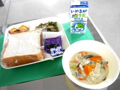 今日の献立は、食パン、牛乳、白菜のクリーム煮、厚あげの醤油だれかけ、豚肉とサンド豆の炒めものでした。おいしかったです。