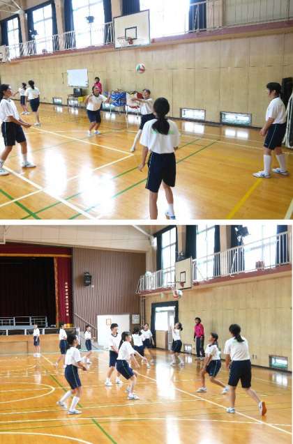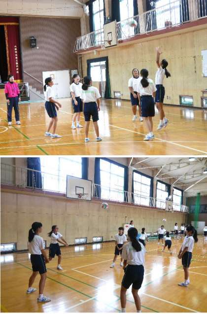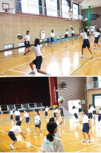 1年の女子の体育は体育館でバレーボールです。まず、ペアになってバレーボールを上手にパスできることが大切です。次にグループで輪になって、ボールパスを30回続くように練習していました。バレー部の生徒が活躍していました。