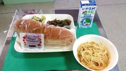 今日の献立は、ライ麦パン、牛乳、牛肉のカレー風味焼き、トマトのスープスパゲッティー、キャベツとキュウリのピクルスです。