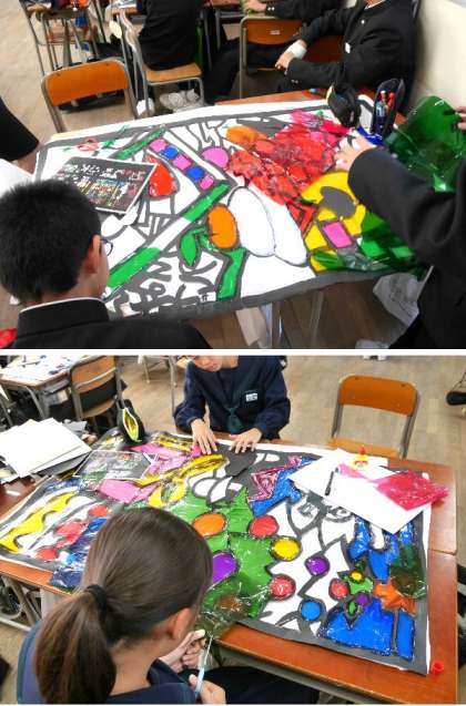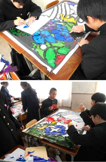 今週の金曜日には文化発表会があります。1年生では展示作品の仕上げにがんばっています。