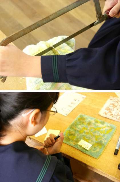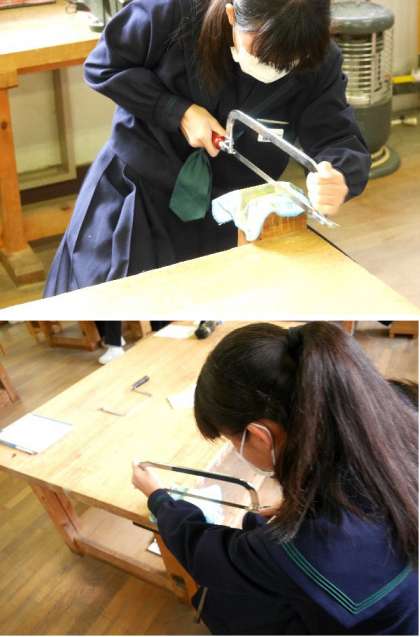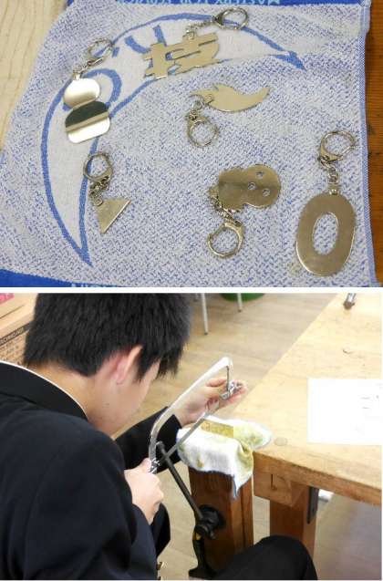 3年の技術科の授業が技術工作室で行われています。ものづくりということで、金属加工をしています。真鍮の板を切り出してキーホルダを作ります。