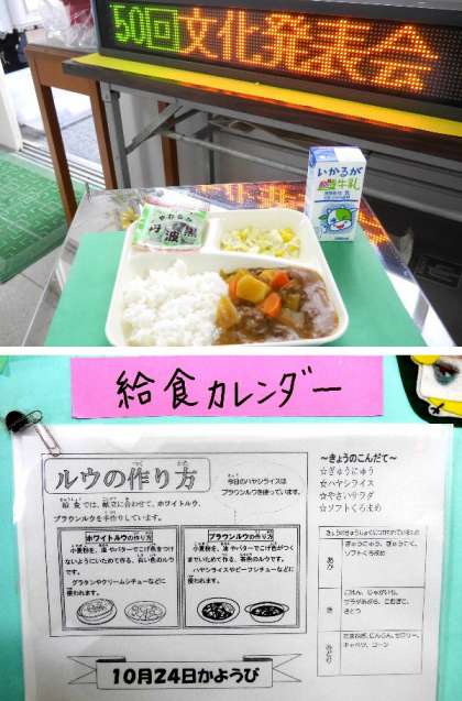 給食見本の後ろでは、校長室前の電光掲示板が見えています。各行事などの文字が流れています。