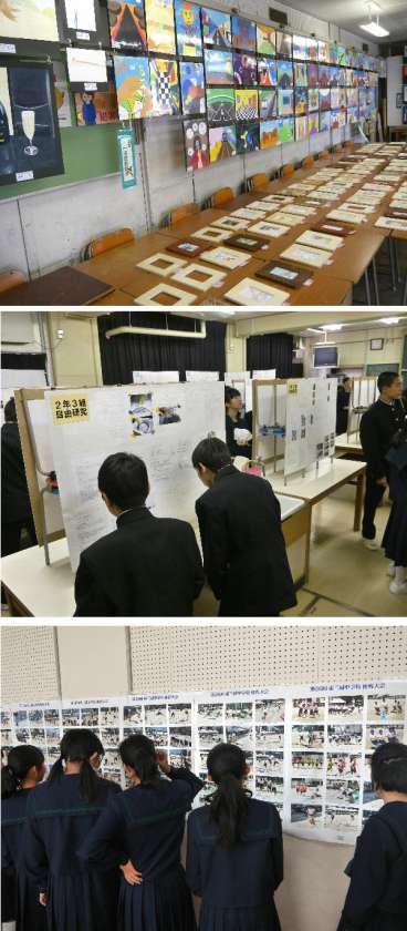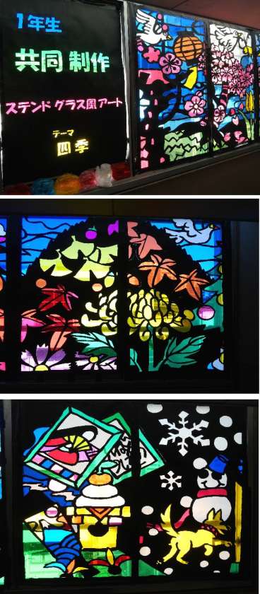文化発表会 午前の舞台の部のあと、各教室での展示を鑑賞しました。美術科、美術部、理科、体育大会の写真、1年学年作品「ステンドグラス風アート」です。
