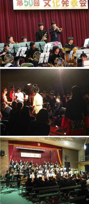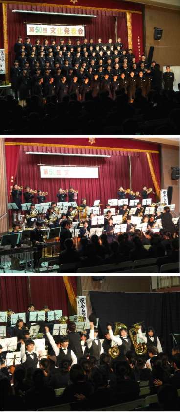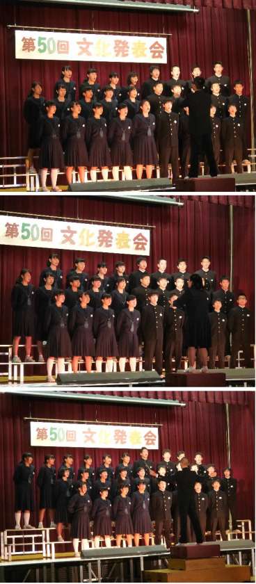文化発表会 午後の舞台の部です。3年合唱で各学級の課題曲と自由曲の発表がありました。最後は課題曲を3年全員で合唱しました。おおとりは、吹奏楽部の演奏です。特別出演もあり大いに盛り上がりました。