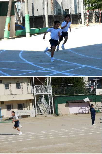 2年男子の体育の授業です。70mのタイムを計っていました。