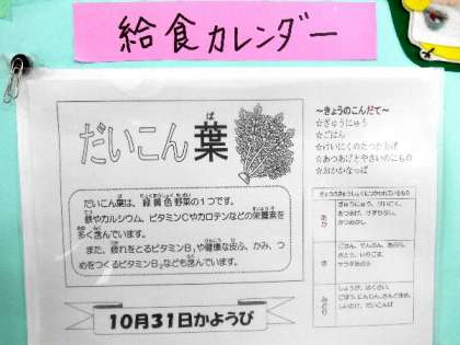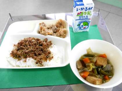 今日の献立は、ごはん、牛乳、鶏肉の竜田揚げ、厚揚げと野菜の煮物、おかかなっばでした。おかかなっぱをご飯にふりかけて、大好きなから揚げをたべるとおいしいですね。よく食べていました。