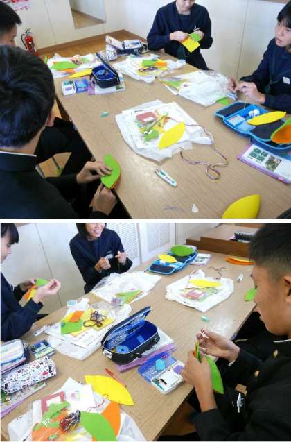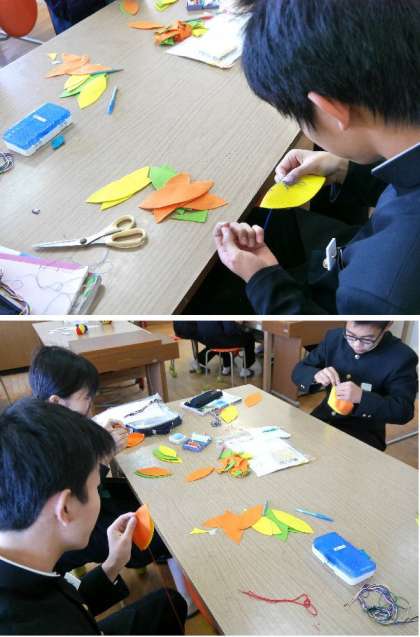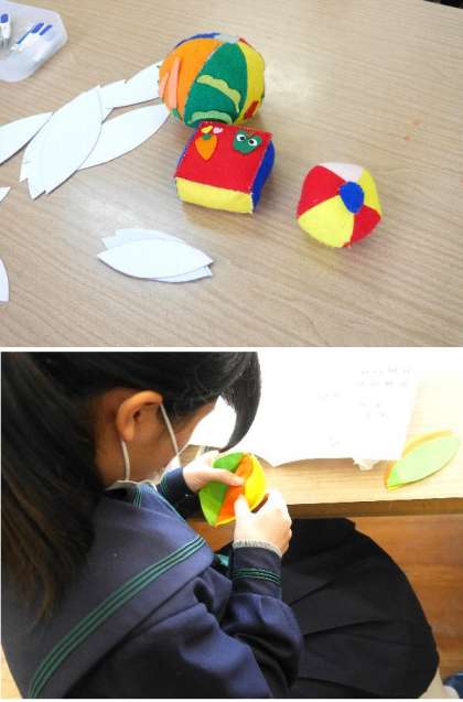 3年生の家庭科の授業では、小さい子どものための安全なおもちゃを作っています。将来のための保育の授業です。慣れない手つきでフェルトを一生懸命に縫っていました。