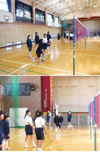 1年生の女子体育ではバレーボールの練習をずっとしてきました。いよいよ最後ま仕上げです。チームに分かれての試合です。上手にレシーブして相手コートに返さないと試合になりません。だいぶ上手になってきました。