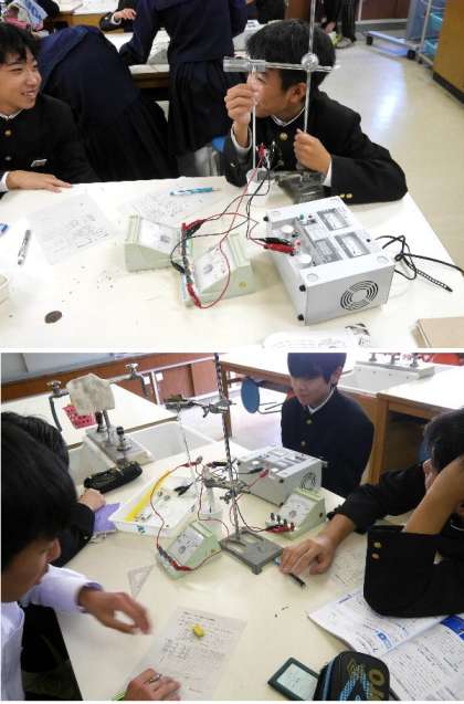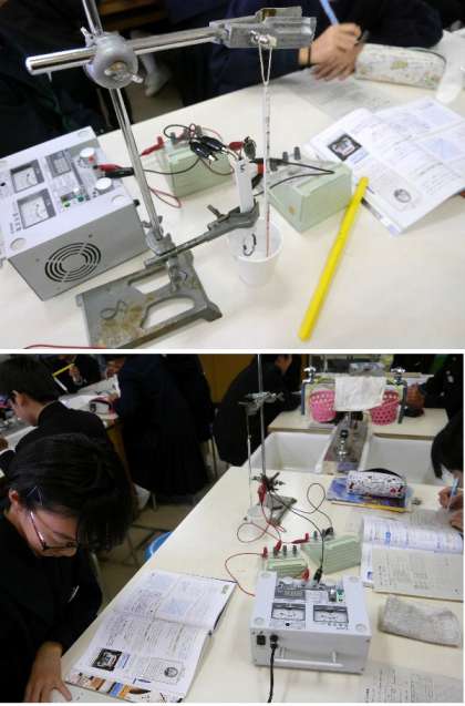 なにやら複雑な実験装置がならんでいます。2年生の理科の授業です。電熱線に電気を流して、水の温度上昇を調べています。