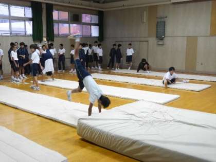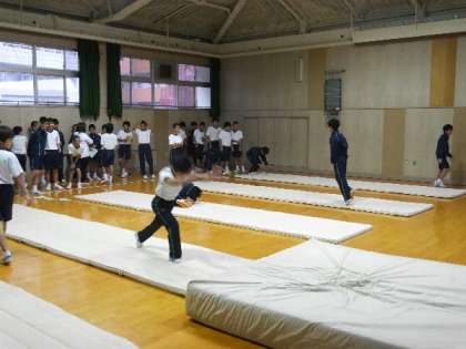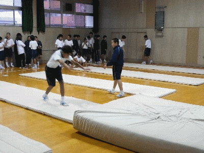 今日は雨天なので、1年の体育の授業は格技室でマット運動です。かっこよく前転できるかな。