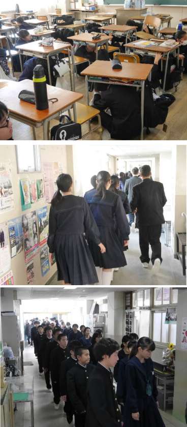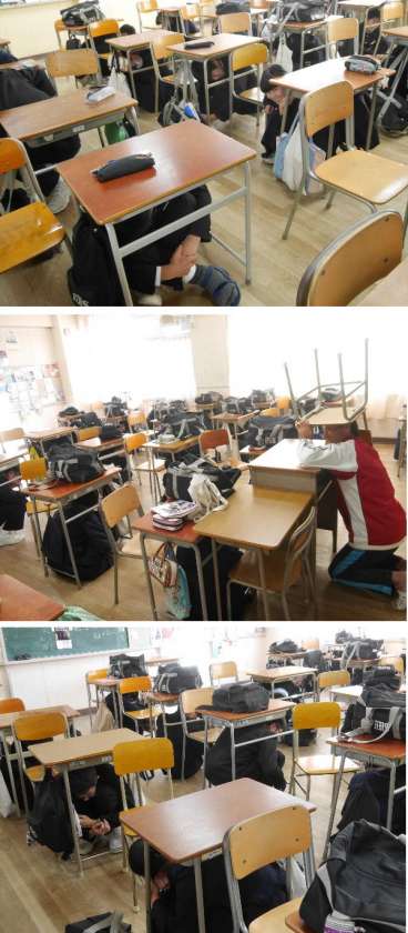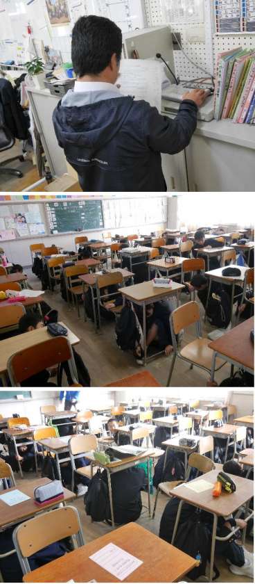 今日は、2回目の避難訓練が行われました。まず、大きな地震がきたので、自分の身を守るために机の下に入ります。その後、津波警報が発令されたので、校舎の3階以上に避難をしました。