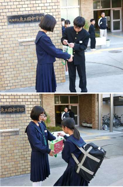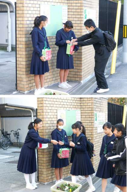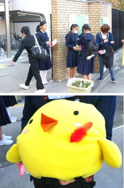 赤い羽根の募金活動の最終日です。たくさんの生徒たちのあたたかい募金をいただきました。ありがとうございました。ひがっびーも赤い羽根をつけてもらってうれしそうて゜す。