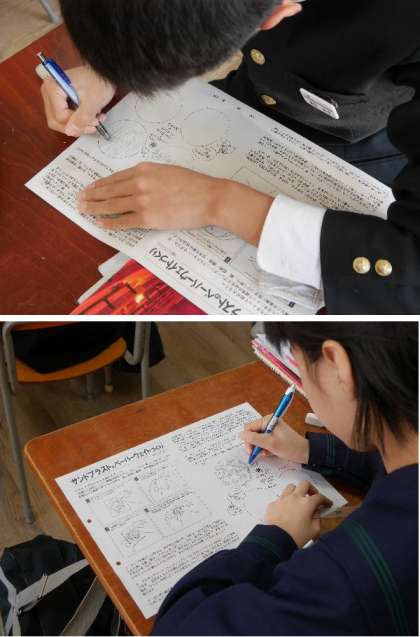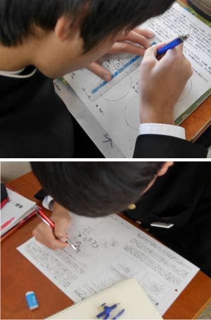 3年生の美術では、サンドブラストのペーパウェイトづくりのためのデザインを考えていました。ガラスの丸い文鎮にデザインをすると、砂を圧縮空気で吹きつけて削り作品になります。出来上がりが楽しみですね。とても実用的な作品です。