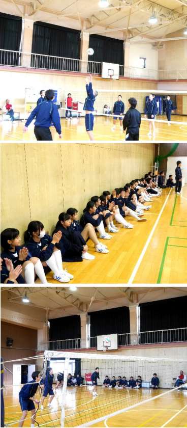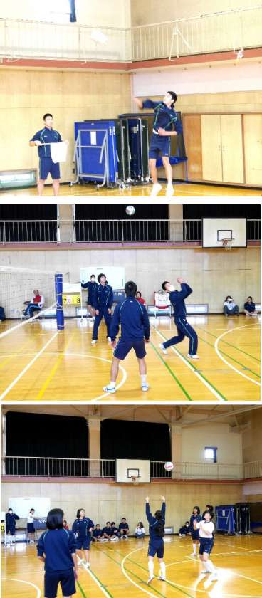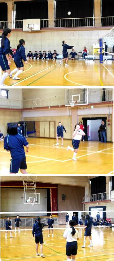 期末テストが終わり、少しほっとしている3年生です。今日はおたのしみ会ということで、体育館でバレーボール大会です。なかなかサーブがきまりません。女子の声援と歓声が体育館中にひびきわたります。
