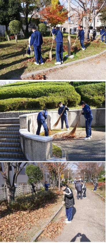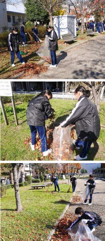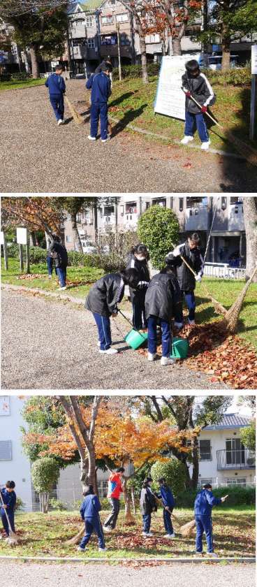 今日の土曜授業の3時間目に、1年生は、十八条東公園北に清掃用具を持ってでかけ、落ち葉やゴミを集める清掃活動をおこないました。とても天気もよく、気持ちよい活動となのました。