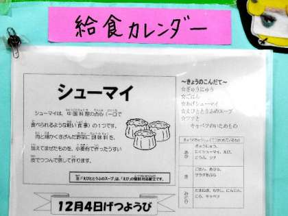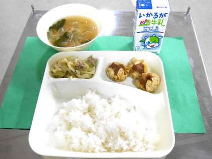今日の献立は、ごはん、牛乳、揚げシューマイ、エビと豆腐のスープ、ツナとキャベツの炒めものでした。