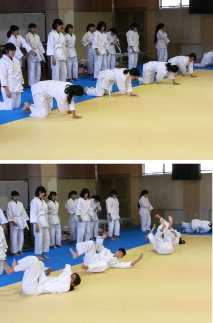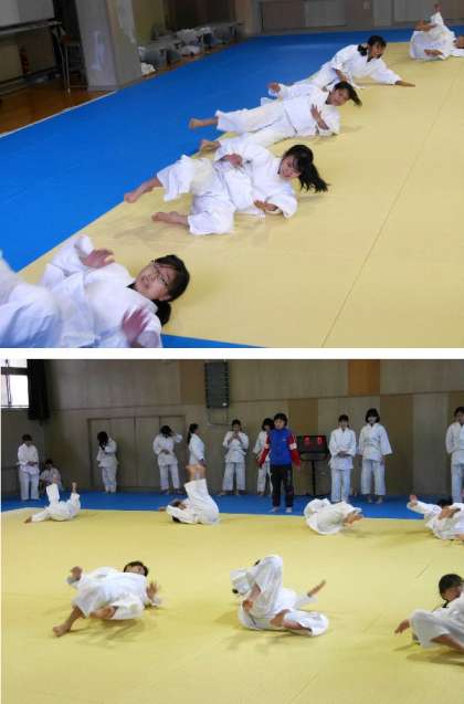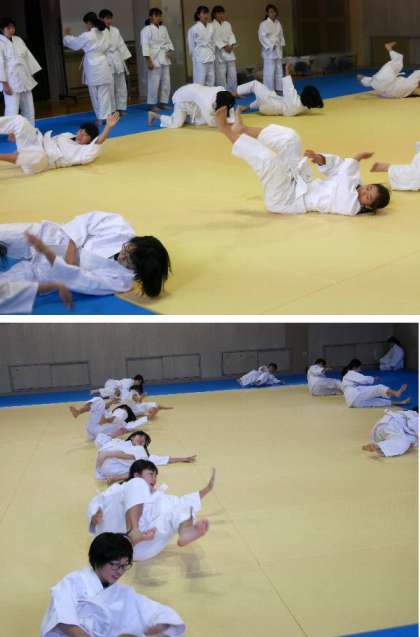 2年生の女子体育では柔道の授業が始まりました。初めて体験する生徒も多いです。最初はまず受け身の練習です。たたみに音がひびきます。