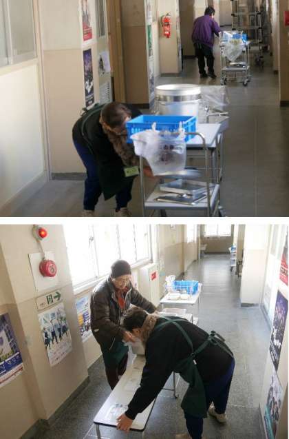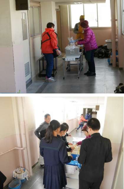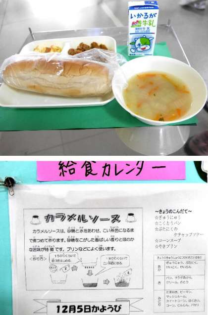 今日の献立は、黒糖パン、牛乳、豚肉のケチャップソテー、コーンスープ、焼きプリンです。毎日寒い日が続きますが、いつも元気アップボランティアさんに来ていただき手伝っていただいています。本当にありがとうございます。