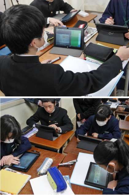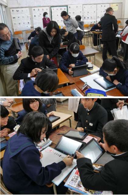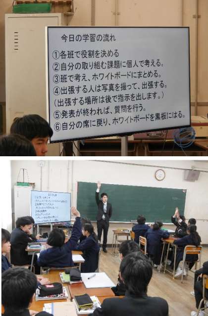 それぞれのタブレットに、先生から資料が配信されてきます。それをもとに話し合いホワイトボードにまとめます。それをタブレットで写真をとってプロジェクタに投影され発表しました。最新式のICTをつかっての授業です。