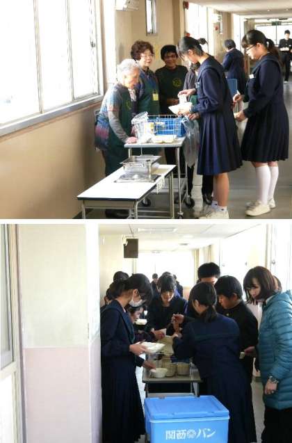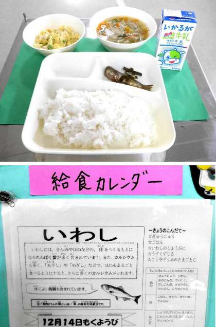 今日の献立は、ごはん、牛乳、イワシのショウガ煮、うすくず汁、高野豆腐の卵とじでした。