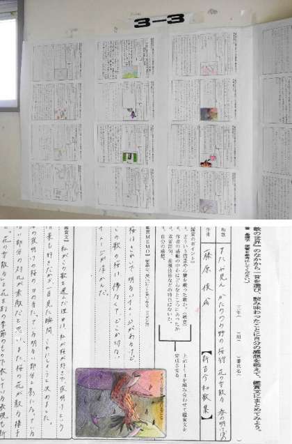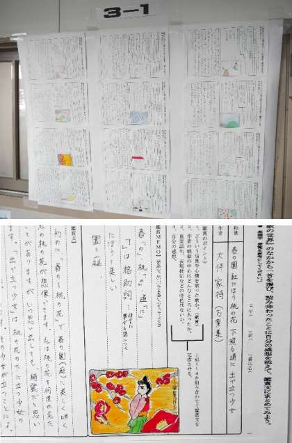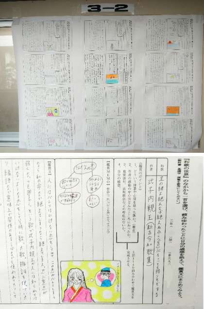 3年生の国語の授業で、和歌を鑑賞しました。自分の好きな和歌を一首選んで、鑑賞して、どういう情景や心情を歌ったのか、作者の感動の中心や感想をまとめています。イメージ図もよくかけていて、細かい描写まで鑑賞しています。一行の文に込められたものたくさんあるんですね。