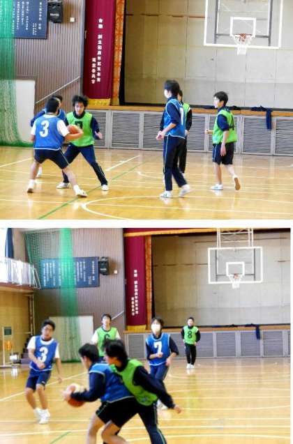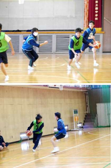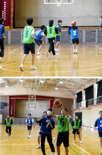 3年男子の体育の授業は、体育館でバスケットボールです。練習試合では生徒たちの躍動感あふれる動きに目をうばわれました。