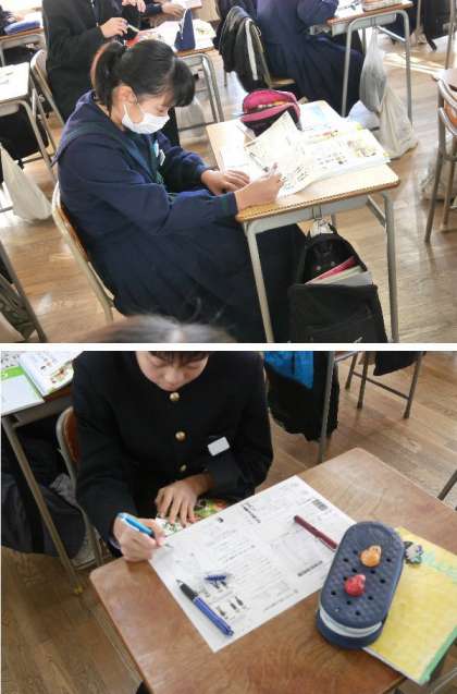 2年生の家庭科では、目的に合った衣服を選んで、自分らしい着方を工夫する学習をしています。生活の中で衣服について考えました。プリントに自分らしいコーディネートを画いていました。見てみると、なるほど、その人らしい服装になっています。コーディネートを楽しむことも大切なことです。また、TPOに合わせた服装についても学習しました。