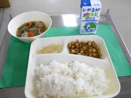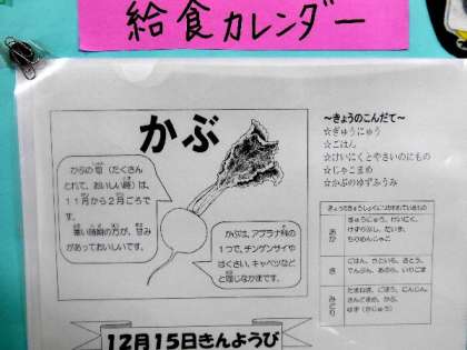 今日の献立は、ごはん、牛乳、鶏肉の野菜の煮物、じゃこまめ、かぶのゆず風味でした。ろうかから、給食のもりつけ見本を見て、「おいしそう」「これ絶対おいしいわ」とはずむ声が聞こえてきました。