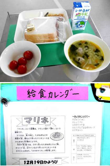 今日の献立は、食パン、牛乳、鮭のマリネ、肉団子と麦のスープ、プチトマトでした。
