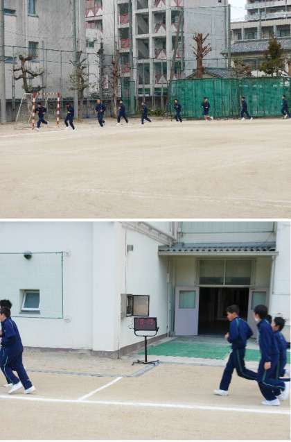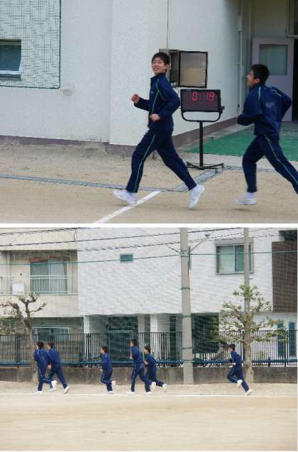 1年生の男子体育の授業です。運動場をタイムをみながら走っています。持久走で1500mをはしっています。お正月の箱根駅伝はすごかったですね。駅伝のようにがんばっていきましょう。
